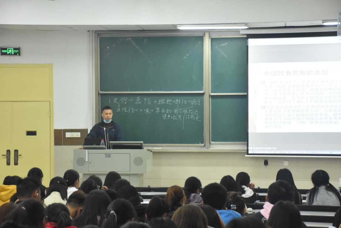 活动开始,李老师向同学们介绍了林继宿教授,同学们用热情的掌声欢迎林教授的到来。在本次讲座中林教授先向大家介绍了饮食民俗的基本概念和中国饮食民俗类型。