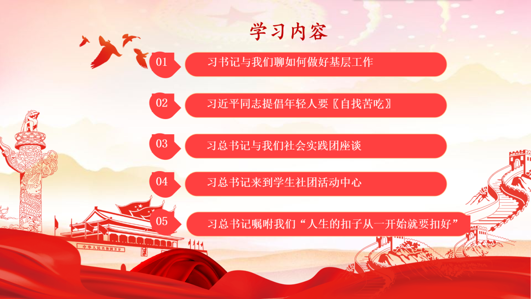习总书记说道:“我们比历史上任何一个时期都更接近中华民族伟大复兴的目标,从来没有像现在这样近。你们年轻人,处于一个伟大的时代,有着这么伟大的目标,可谓生逢其时!希望同学们珍惜宝贵的青春年华,坚持理想,脚踏实地,既勤于学习、善于学习,打牢知识功底、积蓄前进能量,又勇于探索、勇于突破,不断认识科技世界新领地,立志报效祖国,服务人民。”