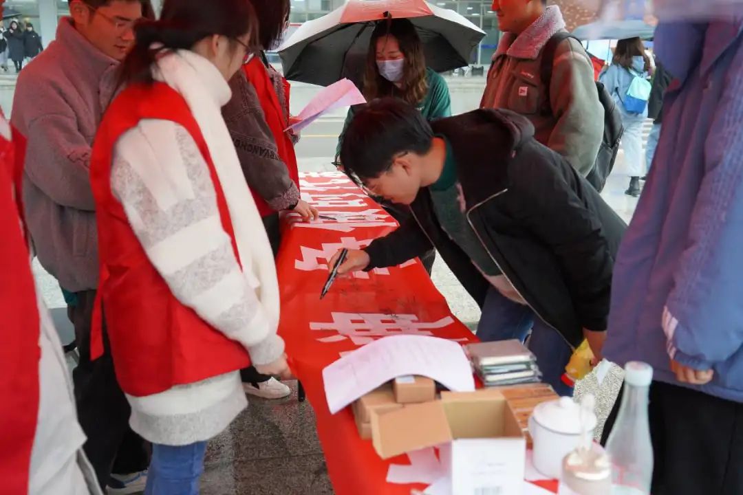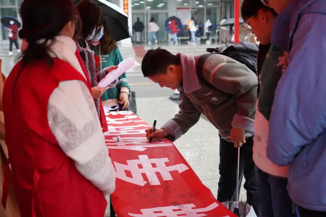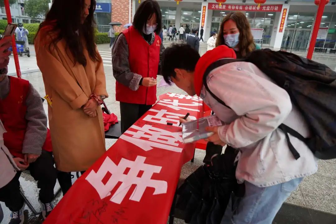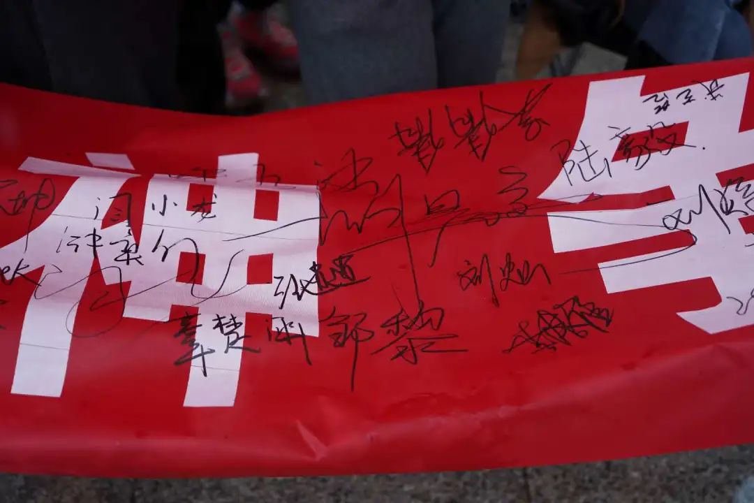 都在横幅上签名并拍照留念