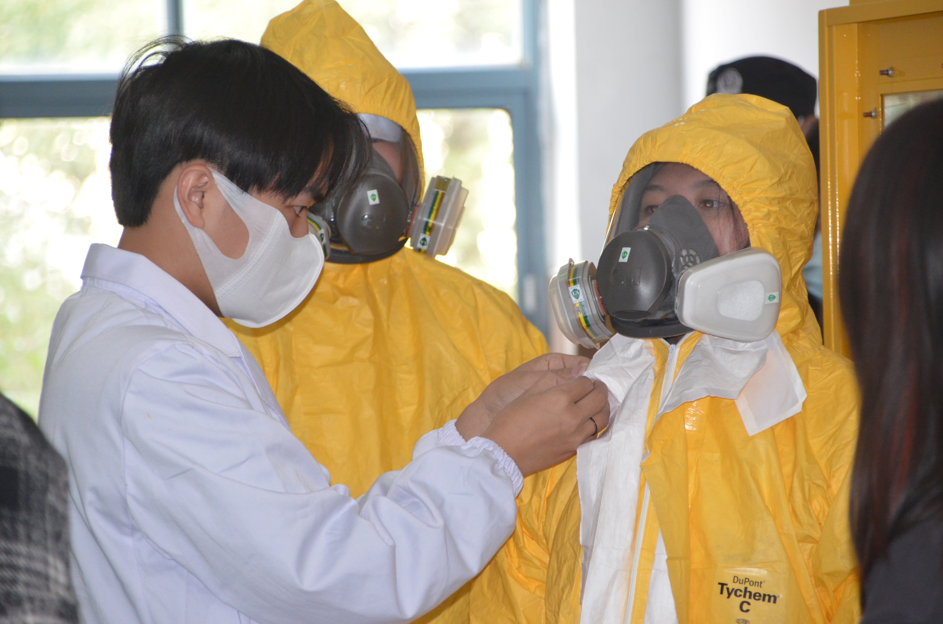 本次活动分为两个环节,首先进行了实验室危化品安全使用的现场培训,由塞弗公司安全培训员以多个触目惊心的案例讲解了实验室危化品的专业知识、使用须知及应急防护措施;之后在实验室开展了一次危化品泄露事故的应急演练,由参与演练的员工代表配合老师一起模拟事故发生现场及应急处置过程:培训员指导演练同学正确穿戴防护服和防毒面具并进行实训讲解,同学们按照指令、井然有序地完成。最终圆满完成此次演练。